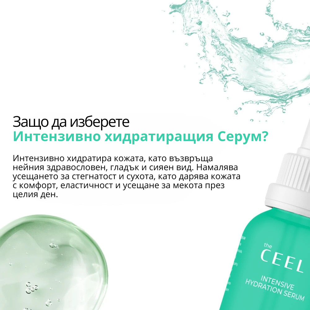 Интензивният хидратиращ серум The Ceel дарява кожата с моментална и дълготрайна хидратация, без усещане за тежест или омазняване. Съставен на водна основа (75–80% Вода) и балансиран до pH 4–5, той прониква бързо и дълбоко, възстановява влагозадържащия капацитет на кожата и подобрява нейната еластичност.