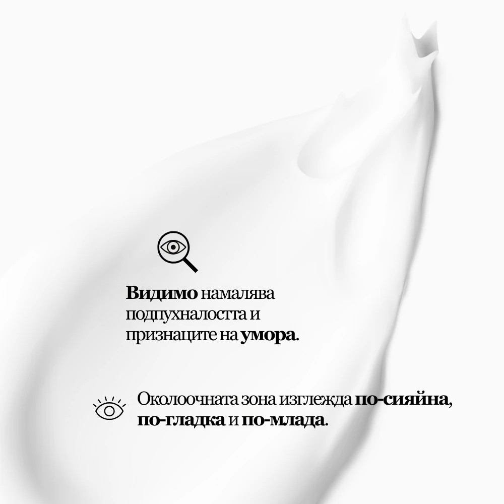 Леката текстура попива бързо, без да оставя мазен или лепкав филм. С всяко нанасяне околоочната зона изглежда по-свежа, по-гладка и тонизирана.