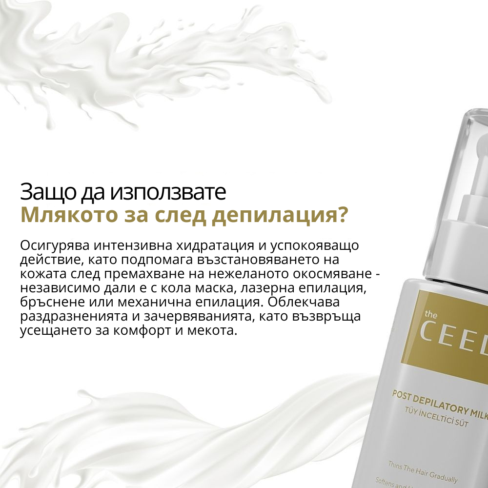 The Ceel Post Depilatory Milk е специализирано мляко за след депилация, създадено да успокои кожата, да намали раздразненията и постепенно да изтъни космите при редовна употреба. Леката формула с хидратиращи хумектанти и възстановяващи емолиенти помага за предотвратяване на сухота, зачервявания и дискомфорт след епилация, бръснене, кола маска или лазерна епилация. Хиалуроновата киселина и глицеринът осигуряват дълбока хидратация и възстановяват мекотата, докато екстрактът от коприва действа тонизиращо, леко стягащо и намалява възпаленията. Комбинацията от внимателно подбрани активни съставки помага за поддържане на защитната бариера и възстановяване след механичното увреждане от премахване на космите. Редовната употреба оставя кожата по-гладка, мека и успокоена, като постепенно подобрява вида и структурата на космите.