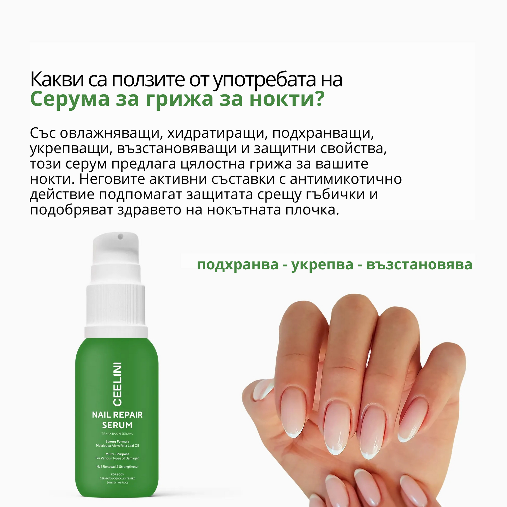 Ceelini Nail Repair Serum е интензивен серум за грижа за ноктите и кожата около тях, формулиран за укрепване, възстановяване и защита. Неговата прецизна формула комбинира мощното действие на масло от Чаено дърво, Салицилова киселина, Алантоин и Глицерин, които работят в синергия за постигане на по-здрави, устойчиви и естетично красиви нокти.